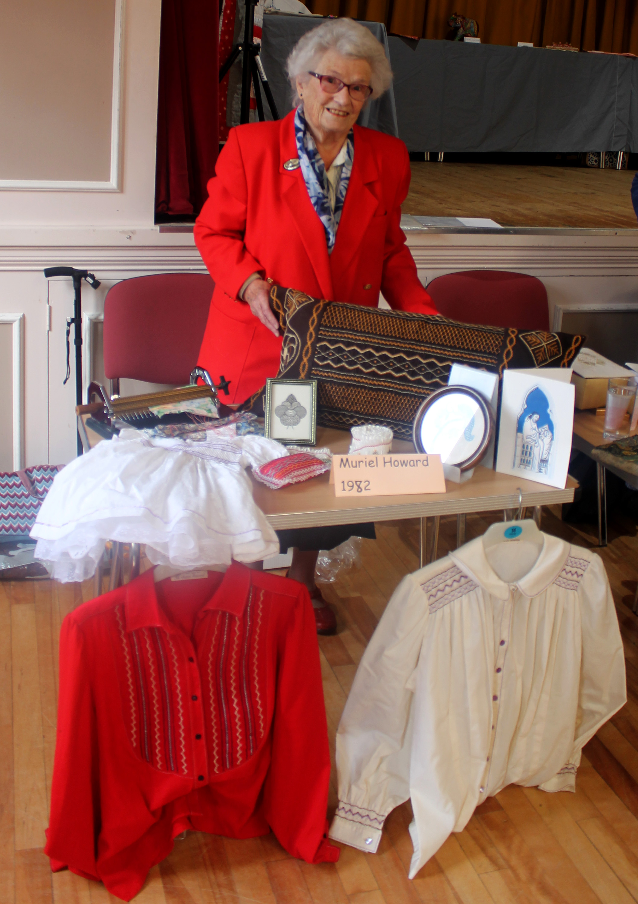 Muriel spoke about being at the initial meeting, in 1982, where a group of City and Guilds students from Bishop Burton College were looking for like minded people to start a society with regular meetings. Muriel brought along samples of intricate smocking and described how the process of gathering the fabric, prior to the embroidery, was greatly improved when the society bought a smocking machine. She also talked about the society having been involved in the Millennium Tapestry, sections of which are still on display in the James Cook Hospital, Middlesbrough.