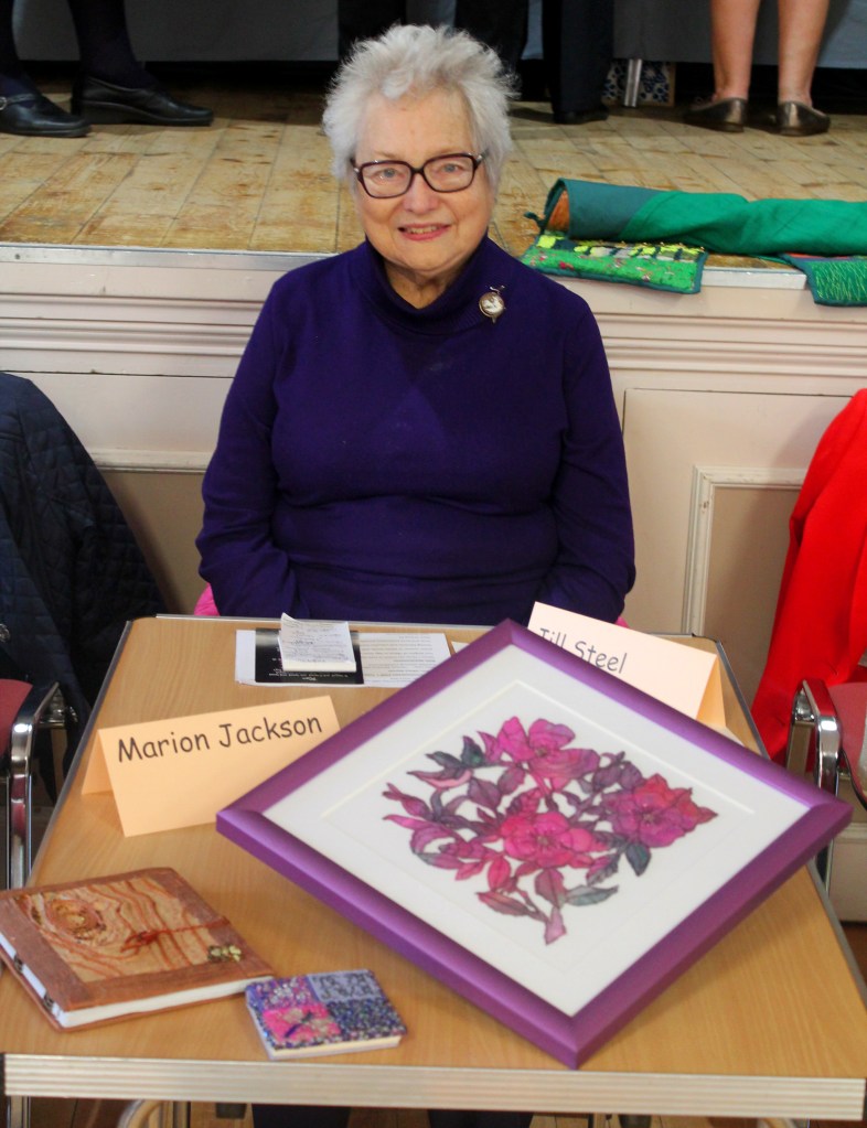 Margaret spoke on behalf of four members , Dorothy, Ann, Joyce and Kathy and their shared memories since joining the society in 1991. Their individual skills range from Dorothy dyeing her own fabrics, to Joyce with her traditional styles including hardanger and pulled threadwork. Margaret emphasised how welcoming these four had been on her first residential visit, helping her develop skills and confidence. She showed the audience a machine embroidered picture of a garden arch Ann had completed on one of these courses.